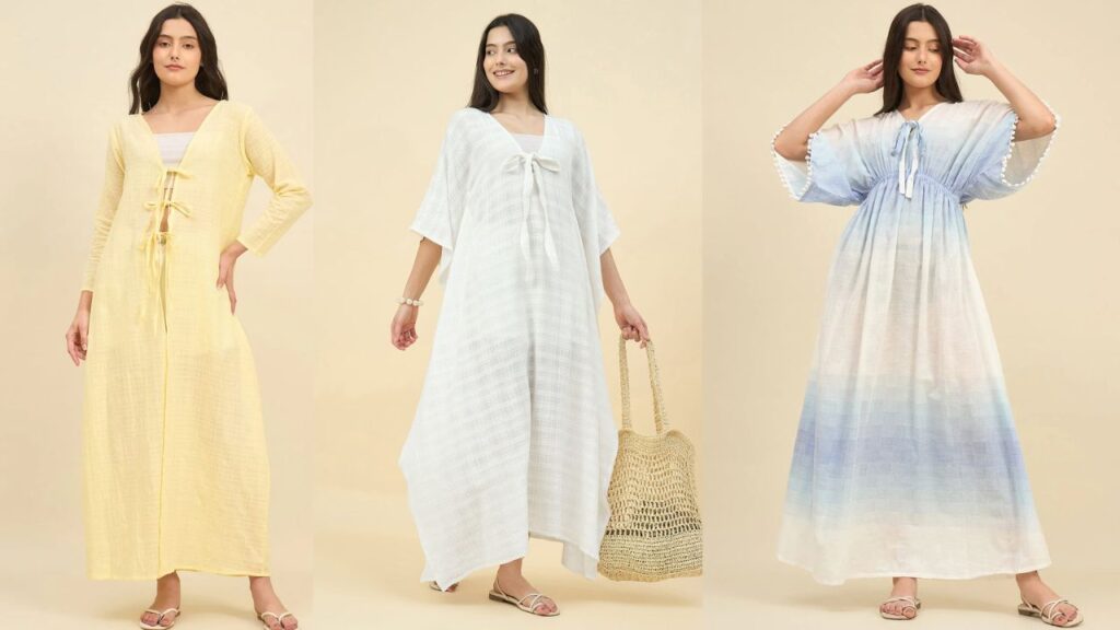A luxe look starts with movement and clean drape. Pick shapes that feel easy but still intentional. A beach kaftan looks expensive when it has a flowy silhouette and a relaxed fit. The fabric should fall smoothly with a non clingy drape instead of sticking to the body. Look for side slits so the hem moves naturally when you walk. This small detail adds airflow and makes the outfit look more “designer.” Pair it with sandals and sunglasses for an effortless beach cover up vibe.
